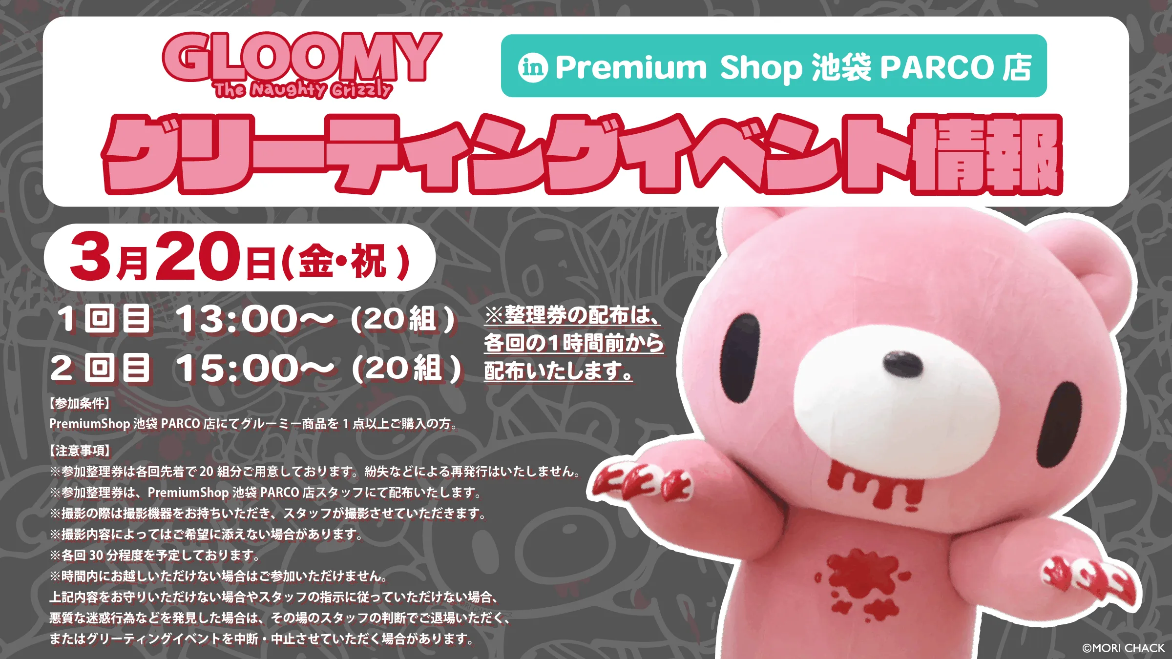 開催日当日に、Premium Shop池袋PARCO店にてグルーミーの商品を1点以上お買い上げいただいた方を対象に、先着順にて参加券を配布いたします。