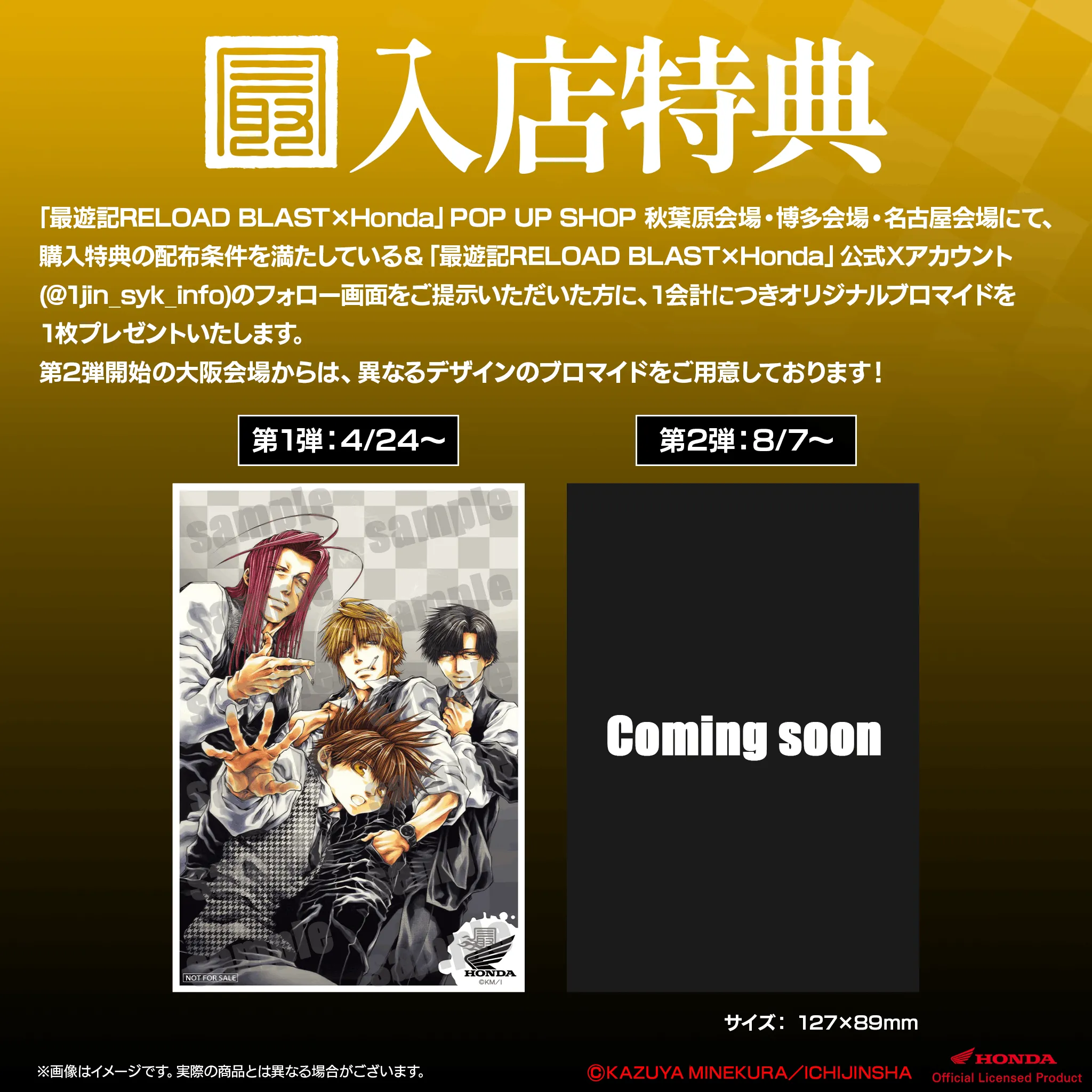 「最遊記RELOAD BLAST×Honda」POP UP SHOP 秋葉原会場・博多会場・名古屋会場にて、購入特典の配布条件を満たしている&「最遊記RELOAD BLAST×Honda」公式Xアカウント(@1jin_syk_info)のフォロー画面をご提示いただいた方に、1会計につきオリジナルブロマイドを1枚プレゼントいたします!